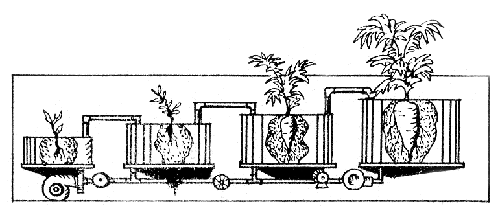 Такую оранжерею придумали. Она совсем особенная, непохожая на другие. Это цепочка из нескольких десятков квадратных ванночек, где с краю самая маленькая, а за нею — всё большие и большие, как куклы-матрёшки, складывающиеся одна в другую. В каждой из них по одному растению. Почвы в ванночках нет совсем. Корни растений висят в воздухе и регулярно через несколько минут автоматически опрыскиваются питательным раствором. В крайнюю ванночку сажают крохотный стебелёк рассады. Ежедневно, по конвейеру, тоже автоматически, каждое растение перемещается на один шаг — из меньшей ванночки в большую. Значит, день за днём самая маленькая ванночка освобождается и в неё сажают новое молодое растеньице, а с другого края, из самой большой ванны вынимают готовую к употреблению морковку, или кочан капусты, или зелёный лук. Для того чтобы обитателей космического корабля снабдить разнообразными овощами, таких цепочек-конвейеров, состоящих из ванночек, должно быть много. Подсчитано, что для обеспечения одного человека свежей зеленью в течение нескольких месяцев нужна площадь ванночек в два квадратных метра, а для десяти человек, соответственно, в двадцать квадратных метров. В больших и мощных космических кораблях будущего конструкторы, вероятно, смогут выделить место для такой оранжереи.