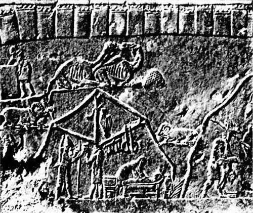 При затянувшейся осаде строили укрепленный лагерь, служивший местом расположения войска. На переднем плане видны две палатки, в которых слуги заняты приготовлением постели и пищи. Слева вверху изображен человек, набирающий, видимо, воду из цистерны. VII в. до н. э. Высота 0,39 м, ширина 0,48 м