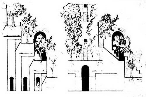 Чертеж-реконструкция Висячих садов должен дать известное представление о том, как это сооружение выглядело в свое время. Слева — поперечный разрез, справа — вид спереди