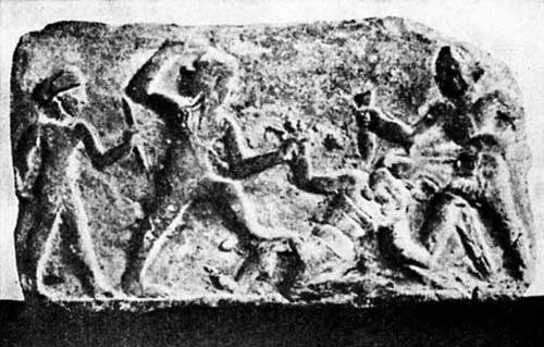 На этом рельефе из терракоты изображена, видимо, борьба героев Гильгамеша и Энкиду с чудовищем Хумбабой. XVIII в. до н. э. Высота 8 см