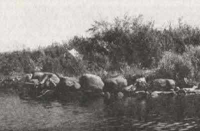 Лагерь разбили на песчаном перешейке, отделяющем залив от озера Затон. Говорят, что в довоенное время оно использовалось для разведения угрей, на что указывает несколько рукотворных каналов, примыкающих к озеру и сохранивших следы былой культуры. Озеро заболачивалось и порождало мириады комаров и гадюк. Место живописное, но не очень уютное для жилья. Перешеек шириной не более 20 м, приютивший палатки экспедиции, заливался водой при сильном волнении. И все же он имел один плюс — продувался, не давая летающим вампирам построиться в боевой порядок.