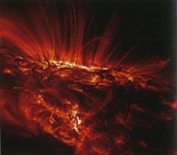 Мы видим здесь звезду, которая знакома нам лучше других. Это наша звезда — Солнце. Как и 300 миллиардов других звезд, она входит в состав Млечного Пути. Ее свету требуется восемь с половиной минут, чтобы дойти до нас. На этой фотографии можно видеть миллиарды тонн материи, выброшенной с поверхности Солнца в космическое пространство.