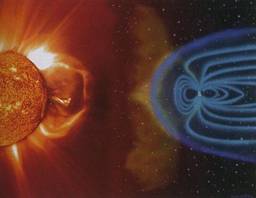 Солнце постоянно излучает в сторону Земли различные виды радиации и некоторые другие частицы, несущие сверхвысокую энергию. От большей части этих смертоносных снарядов нас защищает магнитный щит, который называется магнитосферой. Здесь он изображен синим цветом, но надо помнить, что перед нами не фотография, а условный рисунок. На самом деле магнитосфера невидима для глаза, и Земля находится от Солнца гораздо дальше.