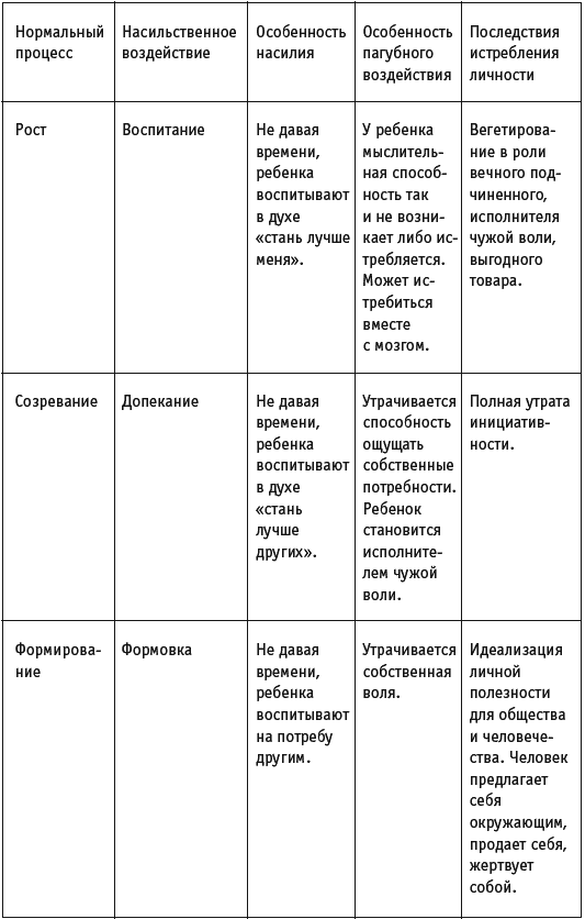 Большинство жертв воспитания даже не понимают, кто они на самом деле. Если они на данный момент заняли свою нишу, они и слышать не желают, что что-то не так. Стыд сознаться в своем позоре хуже смерти. Особенно когда есть надежда на то, что кто-то или что-то сможет помочь (см. таблицу на с. 100).