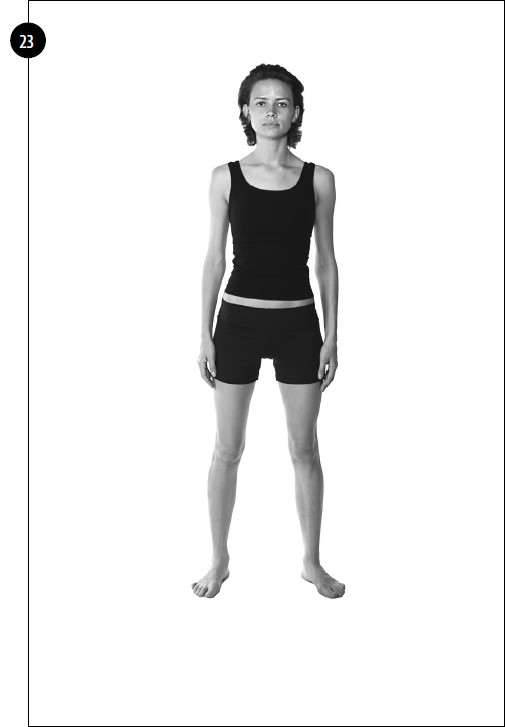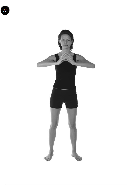 Из исходной позиции выполняем дыхательную технику (см. рис. 19, 20, 21) и втягиваем живот под ребра. Принимаем основное положение — стоя, ноги на ширине плеч, а руками делаем круг и замыкаем его, упираясь в подушечки пальцев, как показано на рисунке 22. Начинайте давить на подушечки пальцев, упираясь в них изо всех сил. Затем вдохните через нос и расслабьтесь. Повторить упражнение семь раз.