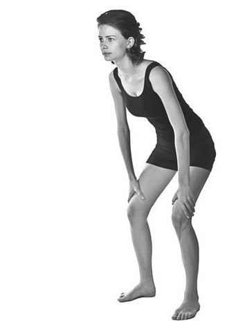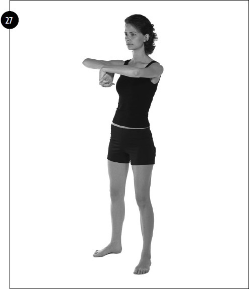 Из исходной позиции выполняем дыхательную технику (см. рис. 24, 25, 26) и втягиваем живот под ребра. Принимаем основное положение — стоя, ноги на ширине плеч, а кисти рук скрещиваем и сцепляем вместе, как это показано рисунке 27.