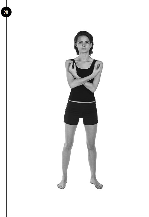 Выполняйте дыхательную технику, как указывалось выше. На втяжке живота, пожалуйста, не теряйте драгоценных секунд, старайтесь как можно быстрее принимать основную позу. Скрестите руки на груди и разверните ладони друг к другу, как это показано на рисунке 28. Сцепите пальцы в замок и, поворачивая их на себя (см. рис. 29), медленно дойдите до уровня груди, как это показано на рисунке 27. В это же самое время начинайте напрягать грудные мышцы, найдите то положение рук, в котором нагрузка на мышцы груди будет особенно интенсивной. Запомните это положение. В следующий подход возвращайтесь в это положение уже быстрее. Держите нагрузку весь период втяжки живота. Чувствуйте, как сила вливается в ваши грудные мышцы, направляйте ее именно туда. Затем выполните вдох через нос и расслабьтесь. Повторить нужно пять раз. С каждым разом ваша мышца будет способна выдерживать большую нагрузку. Отмечайте это для себя.