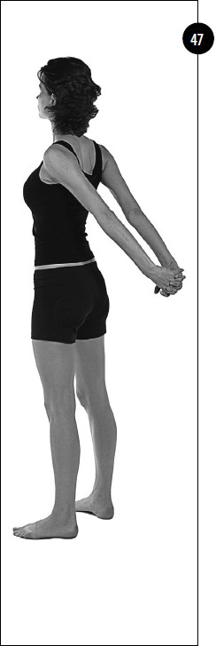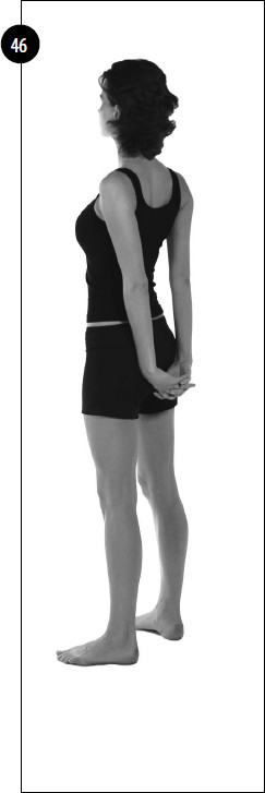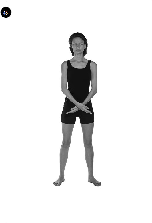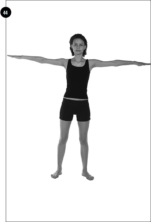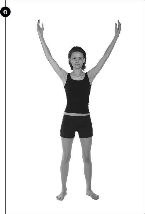 Когда будете выполнять круг, вы должны вытягиваться с помощью рук во все стороны. Посмотрите внимательно на рисунки 42–45. Чувствуйте ваши грудные мышцы, чувствуйте, как натягивается кожа на груди, в области декольте и на шее. Старайтесь вытягивать руки как можно выше вверху и как можно дальше растянуть в стороны. Задерживаться нигде не нужно, выполняйте разминку, плавно вытягиваясь во все стороны. Дышите равномерно. Выполните растяжку три раза.