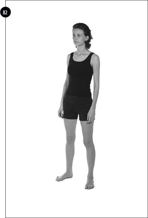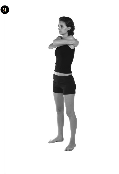 Сделав втяжку живота, принимайте основное положение — стоя, ноги на ширине плеч. Руками обхватите себя за плечи, при этом старайтесь сильно напрячь мышцы груди. Сначала сверху находится правая рука, как это показано на рисунке 81. Держать объятия нужно только на втяжке живота, как только вы сделали вдох, расслабьтесь и примите исходное положение (см. рис. 82). Выполните упражнение три раза. Затем поменяйте положение рук, повторите упражнение три раза.