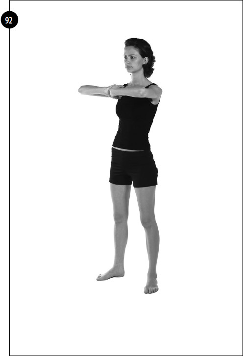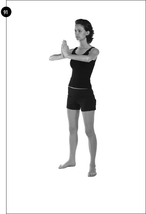 Разверните пальцы к себе и начинайте сильно давить на ладони (см. рис. 92). Стоим в основной позе столько, на сколько хватит сил держать втяжку. Повторить семь раз.