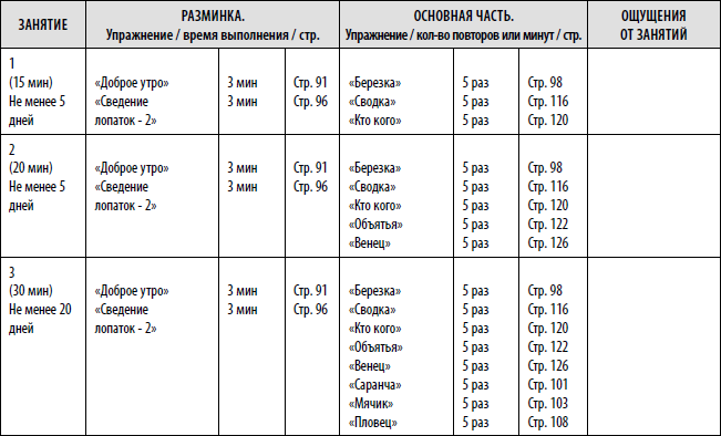 После того как вы немного освоитесь, легко сможете самостоятельно планировать занятия из полюбившихся вам упражнений. А пока проще будет заниматься по предложенному плану занятий. Удачи!