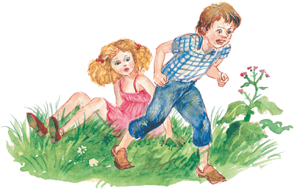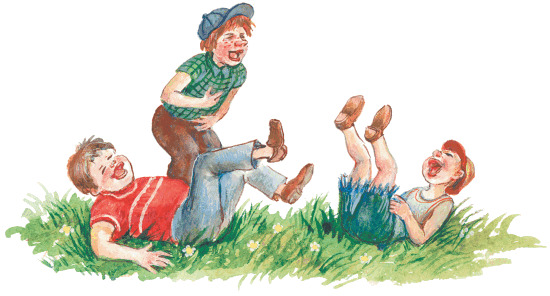 Мальчишки лежали на земле. Они корчились от смеха, из глаз их лились крупные слёзы, ослабевшими руками держались они за животы и хохотали не переставая. Самый маленький мальчишка в коротких штанах лежал на земле, задрав кверху розовые коленки. Он был похож на жука, который лежит на спине и никак не может перевернуться.