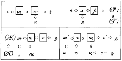 Каждая из смешиваемых в письме букв может одновременно смешиваться по разным параметрам с несколькими другими. В предлагаемых ниже схемах акустико-артикуляционное сходство фонем, приводящее к смешению букв в письме, обозначено горизонтальной стрелкой, а кинетическое сходство букв — вертикальной стрелкой: