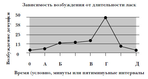 Начальные ласки, прелюдия соответствуют участку «А-Б». В это время происходит явный рост уровня возбуждения, увлажняется слизистая входа во влагалище, набухают соски, появляется румянец на щеках и шее. Желательно, чтобы данный этап по продолжительности был в три-пять раз длиннее самого полового акта!