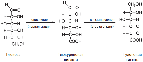 На второй стадии происходит восстановление другого конца молекулы глюкозы, в результате чего образуется гулоновая кислота. На третьей стадии процесса в молекуле гулоновой кислоты образуется циклическая структура, называемая лактоном. Заключительная окислительная стадия приводит к образованию двойных связей в молекуле аскорбиновой кислоты. Именно этот фермент, катализирующий последнюю стадию процесса, как раз и отсутствует в организме человека.