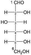 Проекционная формула Фишера для глюкозы. Показана нумерация атомов углерода.