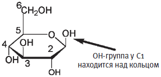 В циклическом виде могут существовать две формы глюкозы, в зависимости от того, располагается ли группа OH у атома углерода C1 над плоскостью кольца или под ней. Может показаться, что это очень незначительное различие, однако это не так: это чрезвычайно важно для структуры более сложных молекул, в состав которых входят звенья глюкозы. Если группа OH у атома углерода 1 располагается под плоскостью кольца, то такую молекулу называют -глюкозой, а если над плоскостью кольца, то -глюкозой.