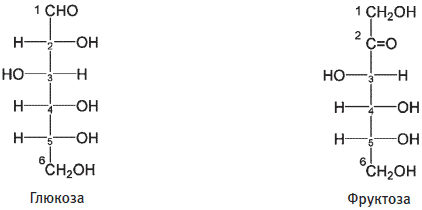 Проекционные формулы Фишера для изомеров глюкозы и фруктозы, показывающие разное расположение атомов водорода и кислорода у атомов углерода С1 и С2. В молекуле фруктозы атомы водорода у С2 отсутствуют.
