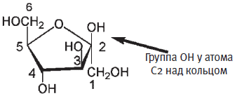 Фруктоза существует главным образом в циклической форме, однако ее структура несколько отличается от циклической структуры глюкозы: фруктоза образует пятичленное кольцо, а не шестичленное, как глюкоза. Фруктоза, как и глюкоза, может существовать в виде — или -формы. Однако с кислородом в кольце соединен углерод С2, поэтому — и -формы фруктозы различаются положением OH-группы именно у этого атома углерода. В -форме OH-группа располагается под кольцом, в -форме — над кольцом.