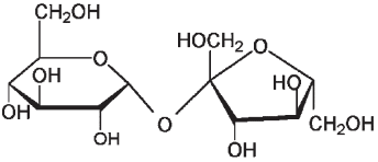 Сахароза содержит равные количества глюкозы и фруктозы, но это не комбинация двух молекул. В молекуле сахарозы одно звено глюкозы и одно звено фруктозы связаны через OH-группу у атома С1 из молекулы -глюкозы и OH-группу у атома С2 из молекулы -фруктозы. При образовании этой связи происходит удаление молекулы воды.