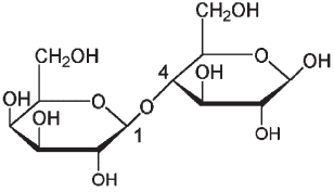 Звено галактозы (слева) через атом С1 соединено с атомом С4 звена глюкозы (справа)