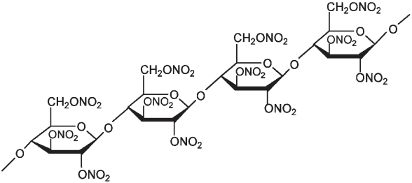 Участок молекулы нитроцеллюлозы: в данном случае атомы водорода из OH-групп заменены нитрогруппами во всех возможных положениях в каждом остатке глюкозы