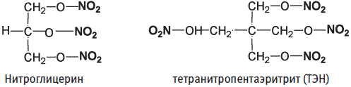 Одно из недавно созданных взрывчатых веществ, тетранитропентаэритрит (ТЭН), к сожалению, также полюбилось террористам — из-за тех же свойств, которые делают это вещество удобным для применения в законных целях. ТЭН можно смешивать с резиной и делать так называемые пластиковые бомбы, которым легко придать любую форму. Химическое название этого вещества может показаться сложным, но его структура достаточно проста. Оно напоминает нитроглицерин, только содержит пять атомов углерода вместо трех и четыре нитрогруппы вместо трех.
