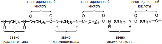 Структура нейлона, демонстрирующая чередование молекул адипиновой кислоты и 1,6-диаминогексана