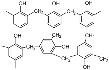 Схема строения бакелита, отражающая наличие перекрестных CH2– связей между молекулами фенола. Здесь показано только несколько возможных вариантов связей. В реальности поперечные сшивки в бакелите располагаются случайным образом.