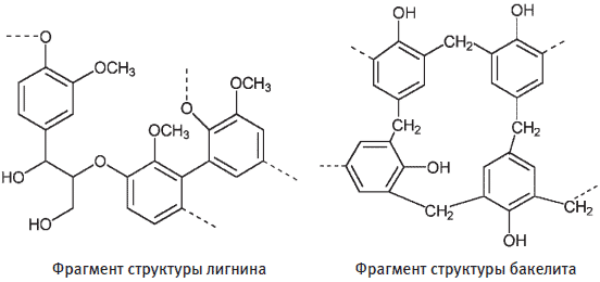 Ниже на рисунке представлена структура фрагмента лигнина с несколькими перекрестными сшивками. Определенно есть некоторое сходство со структурой бакелита.