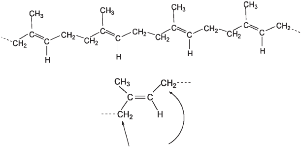 При соединении молекул изопрена образуются новые двойные связи. Все они имеют цис-форму по отношению к полимерной цепи; это означает, что “вход” и “выход” полимерной цепи в каждое мономерное звено осуществляется с одной и той же стороны от двойной связи.