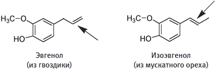 Хотя гвоздика и мускатный орех относятся к разным видам и произрастают на разных островах, разделенных сотнями километров открытого моря, их непохожий запах объясняется присутствием в них удивительно похожих молекул. Основным компонентом гвоздичного масла является эвгенол, а пахучим компонентом мускатного масла — изоэвгенол. Эти ароматные и ароматические молекулы различаются только положением двойной связи: