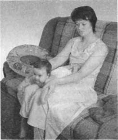 Малыш находится в вертикальном положении у вас на руках, спиной к вам, голова прижата к вашей груди, ножки сложены по-турецки и фиксируются вашей левой рукой.