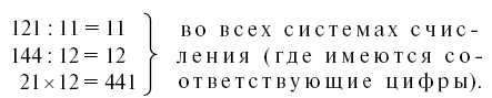 Знакомые с начатками алгебры легко найдут основание, объясняющее свойство этих равенств. Остальные читатели могут проверить их рядом проб для разных систем счисления.