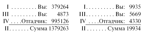 Легко усмотреть, что вы сильно затрудните отгадчика, если ваше второе слагаемое будет заключать больше цифр, чем первое: отгадчик не сможет написать слагаемого, которое уменьшит ваше второе число для оправдания предсказанного им слишком малого результата. Поэтому опытный отгадчик предупредительно ограничивает свободу вашего выбора этим условием.