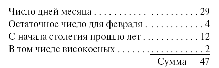 Таким же образом мы найдем, что 15 января 1923 г. приходится на понедельник (14+19 + 4 = 37;37:7 – в остатке 2). Для 9 февраля нового стиля 1917 г. мы нашли бы 39 + 13 + 3 = 55; при делении 55 на 7 получаем в остатке 6 – пятница. Для 29 февраля нового стиля 1904 г.: 59 + 0–1 [33] = 58; остаток от деления на 7 здесь 2 – понедельник.