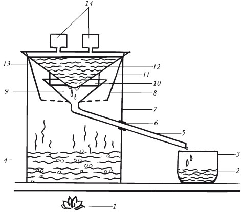 Рис. 3. Самогонный аппарат (схема 3):1 — нагреватель; 2 — самогон; 3 — емкость для сбора самогона; 4 — брага; 5 — трубка; 6 — кусок трубы; 7 — емкость; 8 — проволочная корзина; 9 — воронка; 10 — пластина; 11 — замазка; 12 — холодильник; 13 — вода; 14 — подвод и отвод воды для холодильника