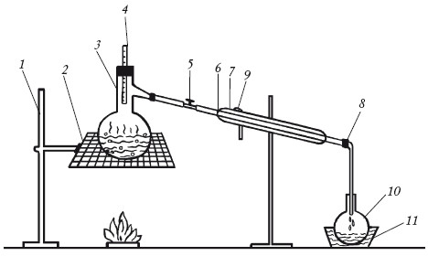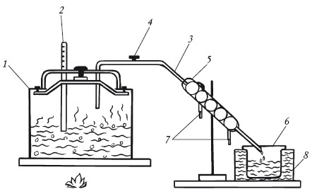 В пробке, закрывающей сосуд, заранее сделано отверстие для термометра. Сбоку сосуда имеется ответвление для выхода паров спирта, оно соединено с трубкой, на которой располагается кран. Трубка соединяет сосуд с холодильником.