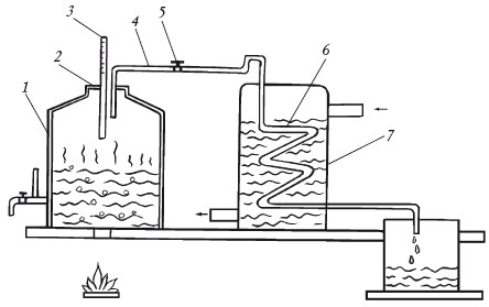 Есть другой вариант перегонного куба со змеевиком. Его конструкция намного сложнее, однако он является более эффективным, поскольку брага нагревается раскаленным паром (рис. 7).