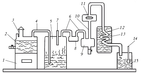 Рис. 7. Самогонный аппарат (схема 7): 1 — топка; 2 — емкость для воды; 3 — труба; 4 — трубопровод для водяного пара; 5 — емкость с брагой; 6 — трубопровод для паров спирта; 7 — термометр; 8 — банка; 9 — сухопарник; 10- трубопровод к фильтру; 11 — фильтр с медными тарелками; 12 — змеевик; 13 — холодильник; 14 — ареометр; 15 — емкость для самогона