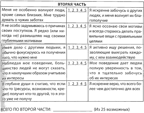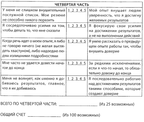 Как я говорил в начале этой главы, есть четыре фактора, создающие доверие. Прежде, чем мы пойдем дальше, возможно, вам будет интересно заполнить анкету для самоанализа, которая поможет вам оценить ваше представление о своем месте относительно этих четырех факторов.