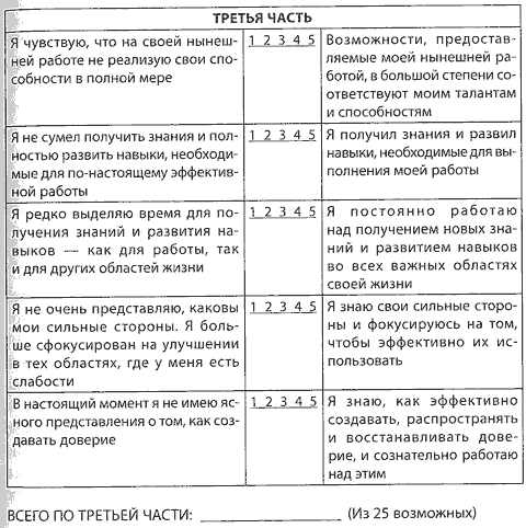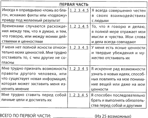 Заранее предупреждаю: это трудные вопросы. Придется честно и глубоко разобраться в себе. Но я призываю вас быть предельно честными с собой. Это поможет вам понять основные элементы, формирующие личное доверие, оценить свои слабые стороны и сфокусировать усилия на том, что принесет вам наибольший результат. Сам факт честного ответа на эти вопросы поможет вам повысить доверие к самим себе — Доверие на Уровне Личности.