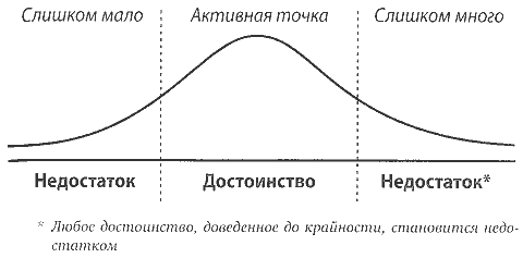 Во-вторых, как и всякое хорошее дело, любой из этих видов поведений можно довести до крайности. А любое достоинство, доведенное до крайности, становится недостатком. При обсуждении каждого из Видов Поведения полезно помнить приведенную ниже картинку. Я буду рекомендовать конкретные способы использования 4 Основ Доверия для достижения на колоколообразной кривой «активной точки» для каждого вида поведения.