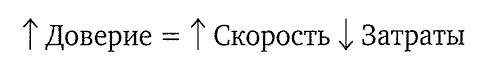 Вот простая формула, которая дает возможность уйти от восприятия доверия как нематериальной и неизмеримой переменной и увидеть в нем необходимый фактор экономической эфективности — вполне материальный и количественно измеримый. Формула строится на следующей критически важной идее: доверие всегда влияет на два результата — на скорость и затраты.