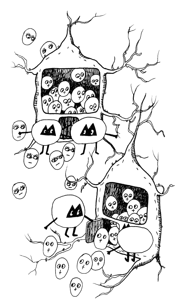 Но вернемся к «проблеме руководства». Как нервная система управляет организмом? Вот очень примитивная схема: представь, что завтрак давно прошел, и в крови уже почти не осталось питательных веществ. Эта кровь по сосудам притекает в головной мозг, где находится центр голода. Центр голода анализирует состав крови и понимает: в крови не хватает веществ, жизненно важных организму. Он дает команду: немедленно повысить уровень питательных веществ в крови! Команда в зашифрованном виде передается в кору больших полушарий головного мозга, оттуда — в спинной мозг и по отходящим от спинного мозга нервам — к ногам, которые как будто сами несут тебя к холодильнику, где лежат вкусные котлеты. Так же примерно все происходит и в организме твоего щенка, который, проголодавшись, сидит у холодильника, умильно виляя хвостиком.
