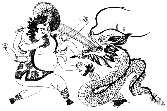 Каких только родственников не бывает на свете! Вот, например, в Китае рассказывают про интересную семейку, Чию и его братьев. Чию был великаном с коровьими копытами, четырьмя глазами и шестью руками. Голова, правда, считалась человечьей — но если на голове четыре глаза, один рог и волосы, которые напоминают вставшие дыбом мечи и трезубцы, то человечьей ее может назвать только неисправимый оптимист. У Чию имелся 81 брат, тоже красавцы: у каждого медная голова с железным лбом, звериное тело и общие для всего семейства черты (коровьи копыта, шесть рук и четыре глаза). Великаны питались песком, камнями и кусками железа. С точки зрения медицины, интересно: а что в процессе пищеварения выходило с другой стороны их организма? Легенды об этом умалчивают. Небесный владыка Хуан-ди, против которого взбунтовались братья, долго не мог победить их — только с помощью дракона Инлуна, повелевавшего дождями, ему удалось осилить великанов. Но это нечестно — с драконом хоть кто победит. Тем более с драконом, повелевавшим дождями, — наверное, братья боялись простуд и сильно не любили насморк. Насморк у великана — да, это проблема…
