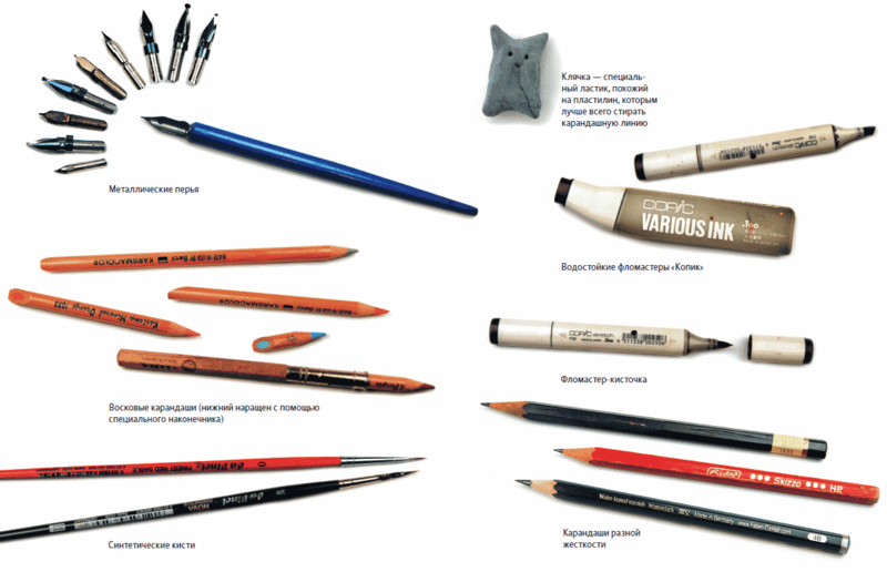Есть синтетические и натуральные. В последние годы синтетические кисти покорили рынок, потому что они дешевле натуральных, практически не стираются и хорошо держат форму. Чтобы рисовать толстые линии с очень тонкими концами, стоит покупать самую тонкую кисть, буквально состоящую из нескольких волосков (при нажиме линия от такой кисти может расширяться до 5 мм и больше). Многие иллюстраторы покупают японские кисти для каллиграфии, потому что они дают очень «мохнатую» и живую линию, хотя быстро теряют форму и ими трудно управлять.
