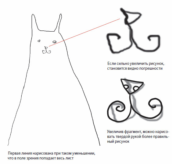 Покупая планшет, рекомендуется прикинуть, поместится ли он на столе. Некоторые иллюстраторы не учитывают, что к официальному размеру рабочего поля прибавится рама шириной в четыре — шесть сантиметров, и удивляются, когда новый инструмент не влезает на стол. Чем больше увеличение, тем тверже линия. Если провести штрих через всю плоскость на картинке с очень большим разрешением, при увеличении на ней обнаружится множество неточностей. Если нужно изобразить очень большой объект, рекомендуется нарисовать его в удобном масштабе, потом сделать слой полупрозрачным, сильно увеличить изображение и нарисовать линию еще раз на новом слое. Обычно достаточно двух или трех слоев, чтобы добиться идеальной линии. На последнем слое особо сложные места можно исправить с помощью ластика и инструмента «лассо», убрав лишние неровности.