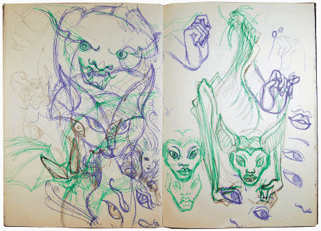 Подобные разработки я могу позволить себе, только если раздумываю над собственной идеей. Заказчикам такое показывать нельзя. Друзья, просматривающие эту тетрадь, не могут разглядеть в сгустках линий ничего осмысленного, в то время как я прекрасно отделяю разные наброски друг от друга.