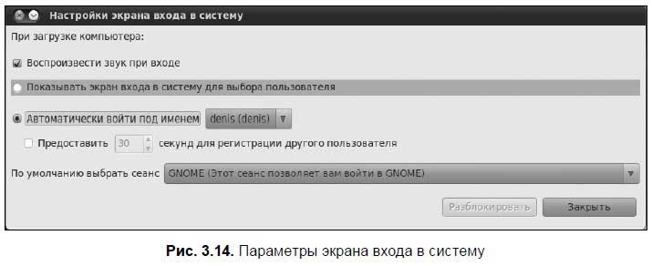 При установке Ubuntu вам предлагалось выбрать возможность автоматического входа пользователя в систему. Если вы почему-то этого не сделали, и вам надоело каждый раз вводить свой пароль, выберите конфигуратор Система | Администрирование | Экран входа в систему. В открывшемся окне нажмите кнопку Разблокировать и в ответ на запрос системы введите свой пароль. Затем включите опцию Автоматически войти под именем и выберите имя пользователя, которое будет использоваться для автовхода (рис. 3.14).